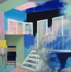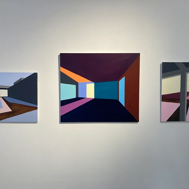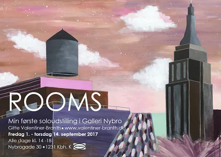”Rooms” kalder Gitte Valentiner-Branth sin udstilling, og det er det, man ser i hendes malerier: rum. Ikke bare ét rum som i billeder med det klassiske centralperspektiv, men flere overlappende hinanden som i en collage.